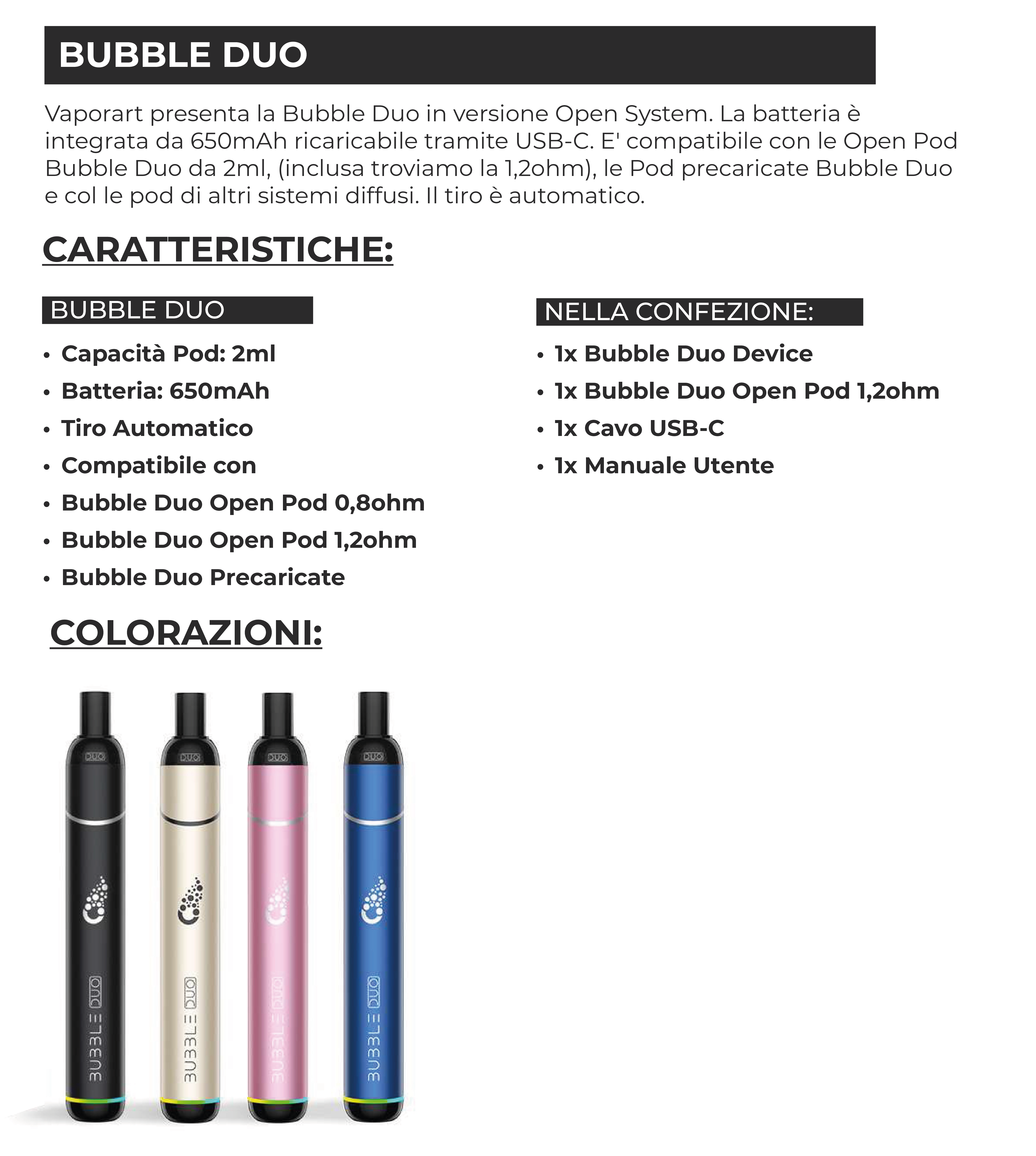 Vaporart presenta la Bubble Duo in versione Open System. La batteria è integrata da 650mAh ricaricabile tramite USB-C. E' compatibile con le Open Pod Bubble Duo da 2ml, (inclusa troviamo la 1,2ohm), le Pod precaricate Bubble Duo e col le pod di altri sistemi diffusi. Il tiro è automatico.