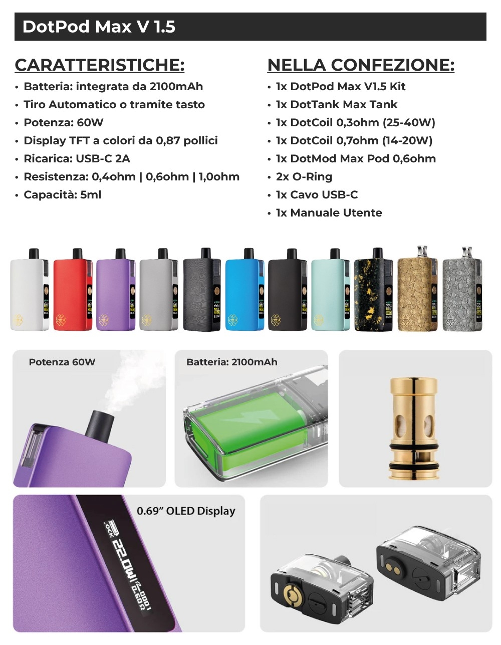 DotPod Max V1.5 Kit by DotMod. È alimentata da una batteria integrata da 2100mAh, con una potenza massima di 60W ed è ricaricabile tramite USB-C.