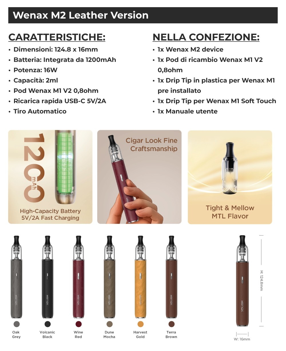 Wenax M2 by Geek Vape. Ecco la nuova edizione in pelle di uno dei prodotti più venduti sul mercato. Il design della Pen Style rimane lo stesso della precedente, mantenendo anche le dimensioni e il peso simili. La batteria integrata invece è più grande, ora da 1200mAh con una potenza massima di 16W ed è ricaricabile tramite USB-C. La Wenax M2 è compatibile con tutte le Pod Wenax M, comprese le Pod Precaricate. Inclusa nella confezione troviamo la Pod Wenax M1 V2 da 0,8ohm. Il tiro è automatico.